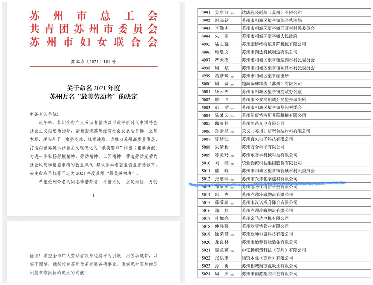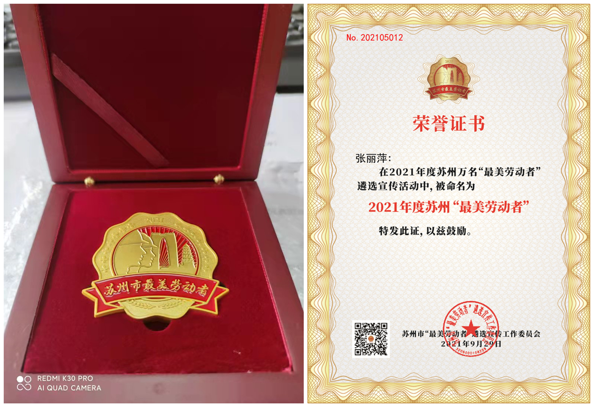 2021年10月,公司財務部經(jīng)理張麗萍榮獲2021年度蘇州市最美勞動者榮譽稱號。