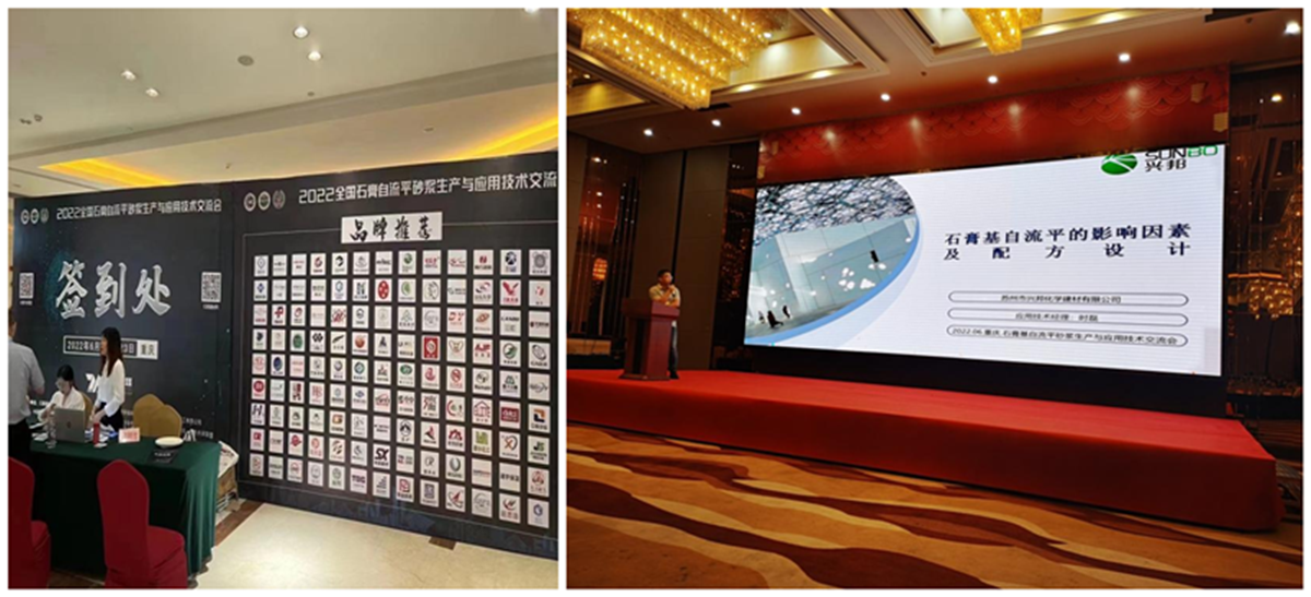 2022年6月20日-23日,2022全國(guó)石膏基自流平砂漿生產(chǎn)與應(yīng)用技術(shù)交流會(huì)在重慶舉行。一直專(zhuān)注、專(zhuān)業(yè)生產(chǎn)中國(guó)特種砂漿助劑產(chǎn)品的企業(yè)—蘇州市興邦化學(xué)建材有限公司再次參加。公司技術(shù)骨干時(shí)磊會(huì)中針對(duì)《石膏基自流平的影響因素及配方設(shè)計(jì)》進(jìn)行精彩分析演講。